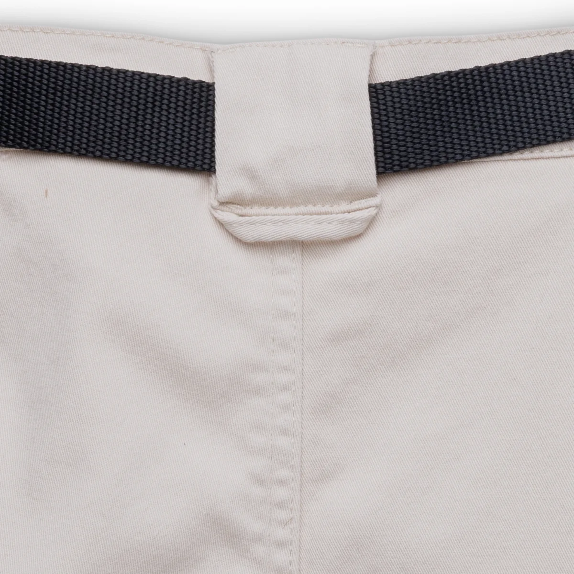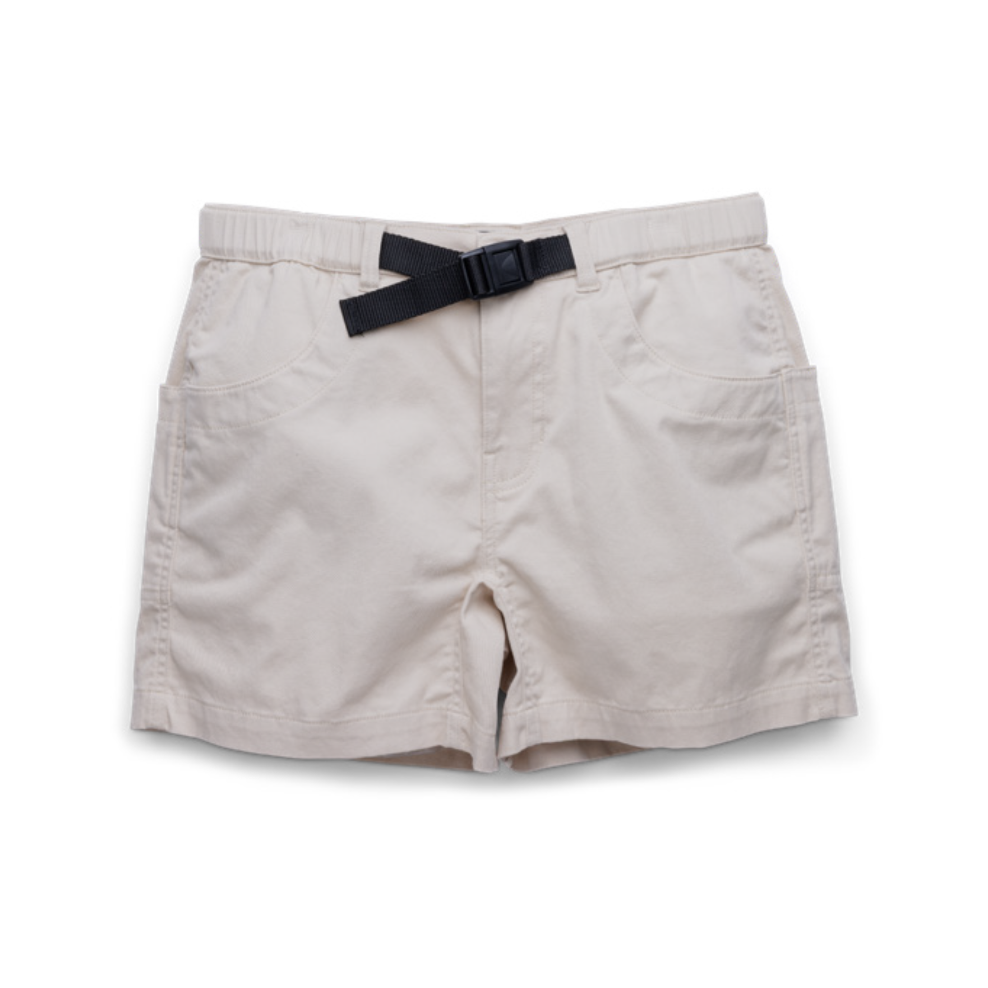 Semi fitted mid-rise short, elastic waist with built in webbing belt and center release buckle, button and zip fly, half-moon pockets, gusset, double needle reinforced seams.